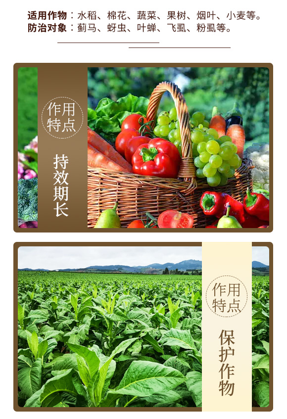 適用作物︰水稻、棉花、蔬菜、果樹、煙葉、小麥等。