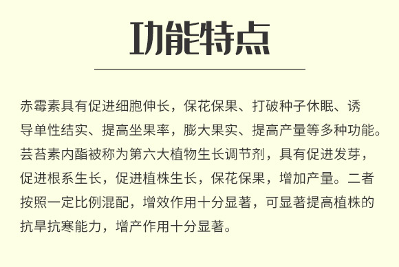 赤霉素具有促進(jìn)細(xì)胞伸長,;ū9⒋蚱品N子休眠、誘導(dǎo)單性結(jié)實(shí)、提高坐果率,膨大果實(shí)、提高產(chǎn)量等多種功能。蕓苔素內(nèi)酯被稱為第六大植物生長調(diào)節(jié)劑,具有促進(jìn)發(fā)芽,促進(jìn)根系生長,促進(jìn)植株生長,保花保果,增加產(chǎn)量。二者按照一定比例混配,增效作用十分顯著,可顯著提高植株的抗旱抗寒能力,增產(chǎn)作用十分顯著。