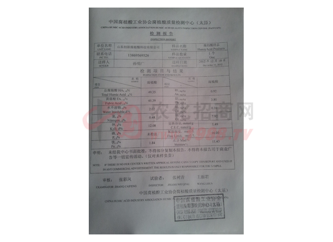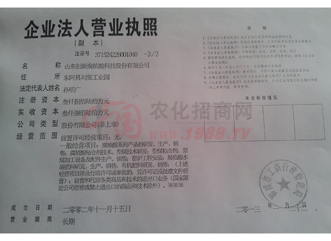山東創(chuàng)新腐植酸科技股份有限公司是一家專業(yè)從事腐植酸礦山開采,腐植酸系列產(chǎn)品研發(fā)、生產(chǎn)的股份制國家高新技術(shù)企業(yè)。企業(yè)創(chuàng)立于2002年,位于中國阿膠文化和佛樂文化的發(fā)源地——山東省東阿縣,注冊資金3860萬元,凈資產(chǎn)8000多萬元。企業(yè)是中國腐植酸工業(yè)協(xié)會副理事長單位,2010年獲全國腐植酸烏金杯獎。已獲三項(xiàng)發(fā)明專利、兩項(xiàng)實(shí)用新型專利授權(quán)。已通過ISO9001質(zhì)量管理體系認(rèn)證和ISO14001環(huán)境管理體系認(rèn)證,是山東省環(huán)保產(chǎn)業(yè)骨干企業(yè),公司被山東省科委認(rèn)定為山東省腐植酸工程技術(shù)研究中心,2010年獲國家科技進(jìn)步二等獎。