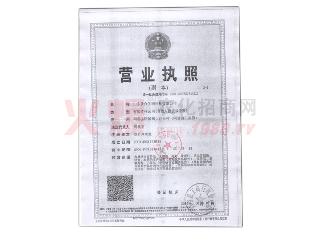 山東貴合生物科技有限公司始建于2005年7月,位于陽(yáng)谷縣阿城鎮(zhèn)工業(yè)園,占地面積11988平方 米,房屋建筑面積3782平方米。公司注冊(cè)資金1000萬(wàn)元,為有限責(zé)任公司,經(jīng)營(yíng)范圍為生產(chǎn)、 銷售農(nóng)藥,年設(shè)計(jì)生產(chǎn)能力1000噸。主要從事以殺蟲、殺菌劑為主的農(nóng)化產(chǎn)品的研發(fā)、生產(chǎn)與 銷售。